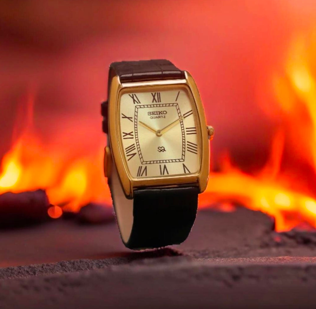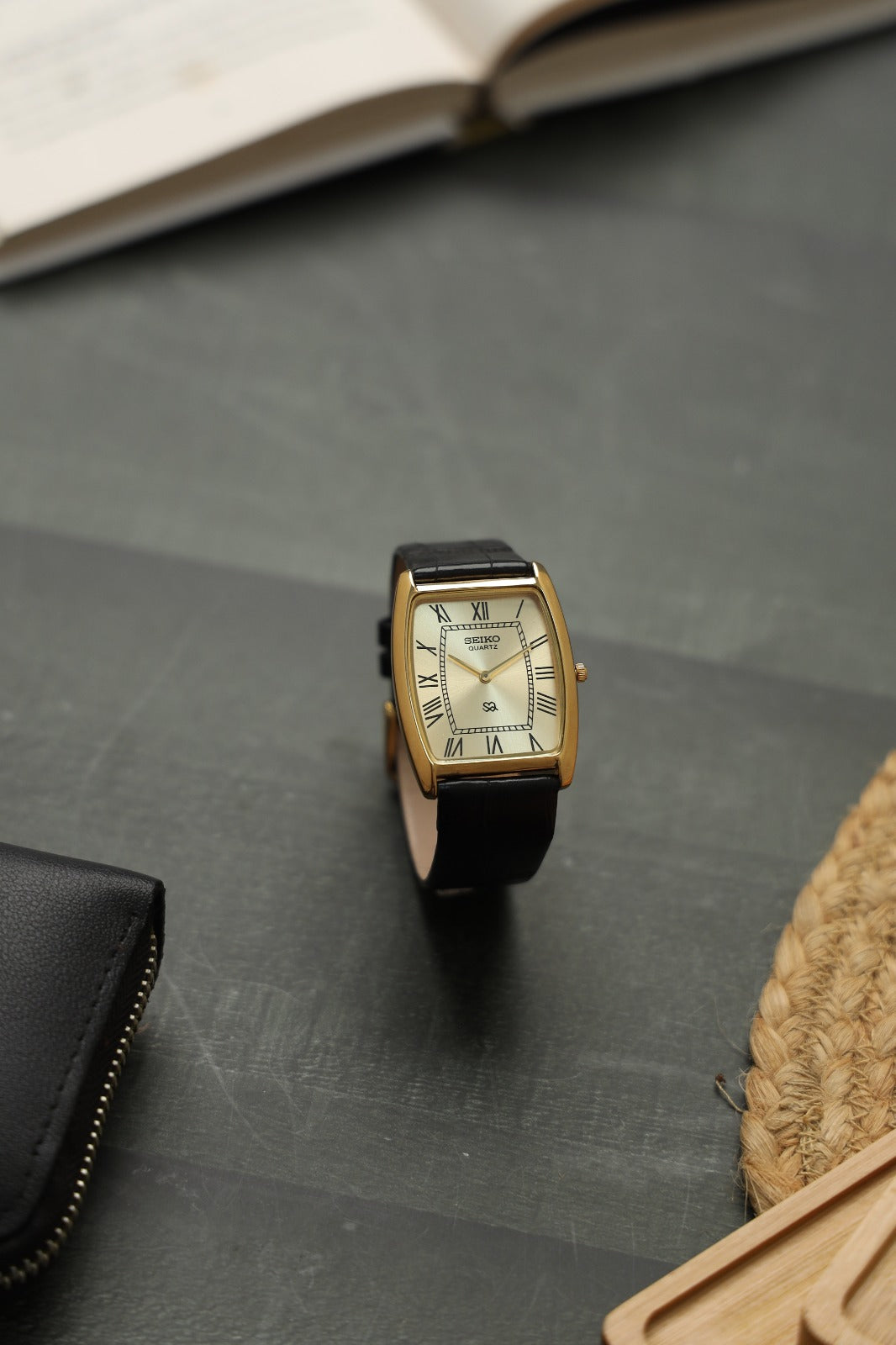 Seiko Quartz Super Slim Two Hands Japan Made Gold Plated Case Golden Dial Wristwatch